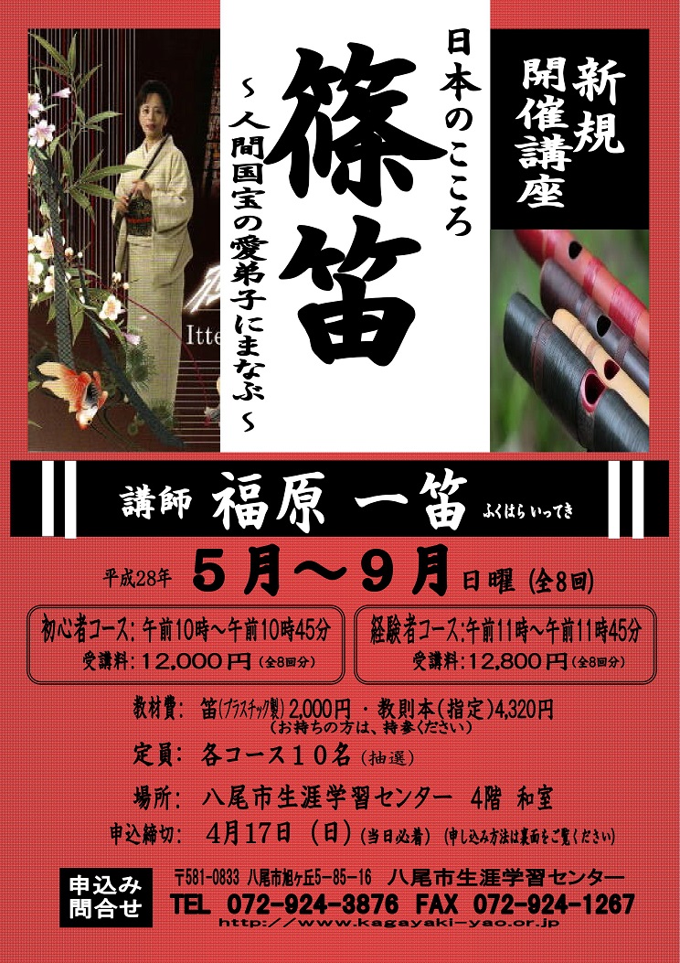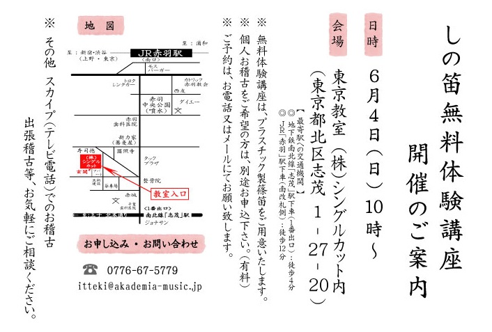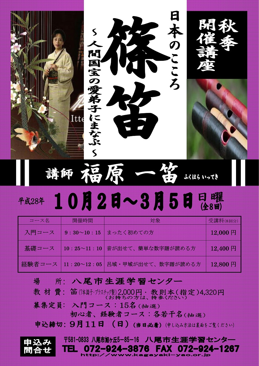 詳しくは、HP「横笛教室」のお問い合わせフォーム又はお電話にてお問い合わせ下さいませ。