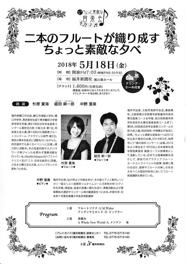 我が教室の教え子、福井市出身「福井県立藤島高校」を経て「大阪教育大学大学院教育学研究科芸術文化専攻音楽表現コース」を修了した経田耕一郎君と、鯖江市出身「福井県立高志高校」を経て「東京藝術大学音楽学部器楽科」を卒業した杉原夏海さんの二人が、福井新聞社主催「福井新聞・風の森ホール」で行われます『ちょっと素敵な演奏会』に出演のご案内です。